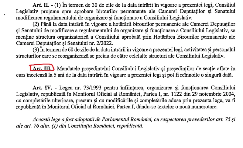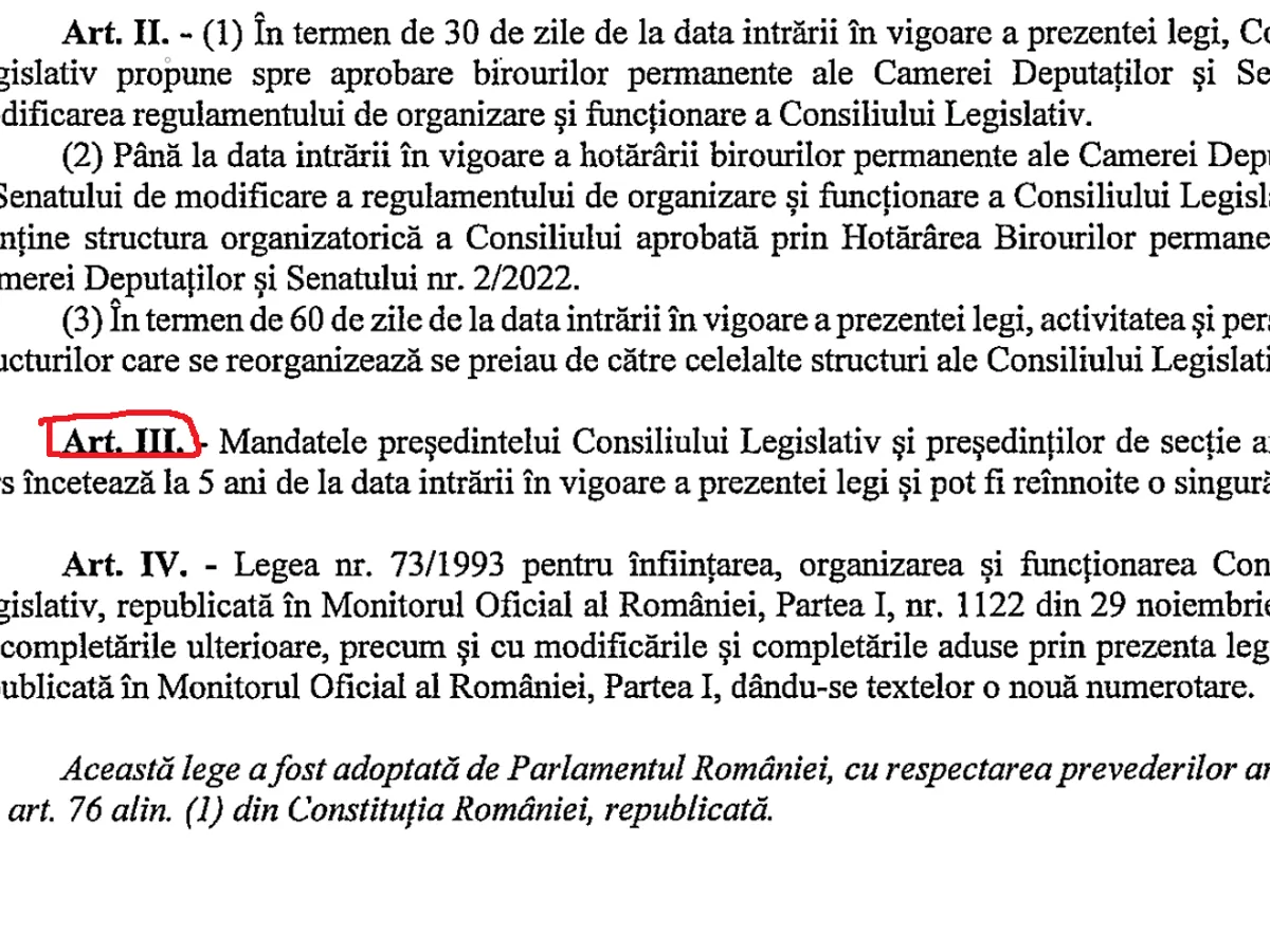 Paragraful cel mai insteresant spune că „mandatele președintelui Consultativ, ale președinților de secție aflate în curs încetează la 5 ani de la data intrării în vigoare a prezentei legi și poate fi reînnoit o singură dată”.