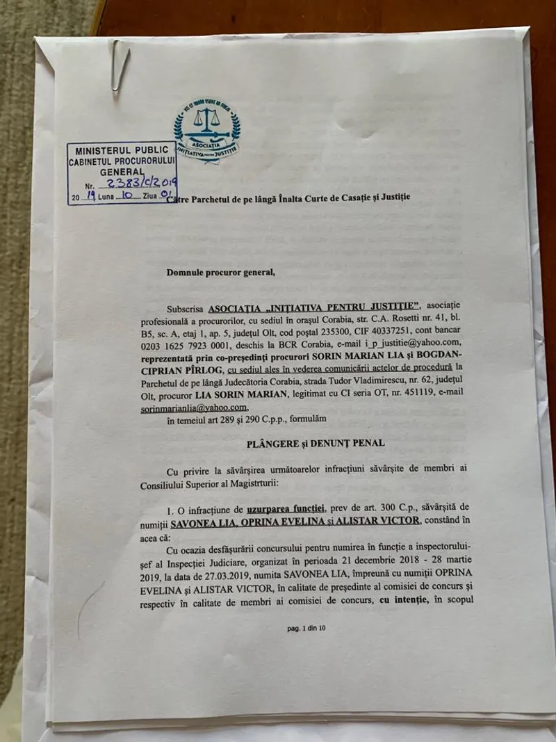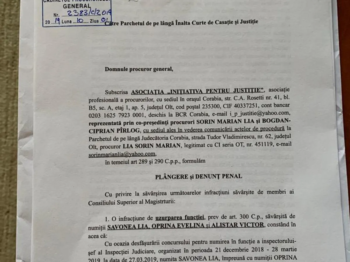1. „O infracțiune de uzurparea funcției săvârșită de Lia Savonea, Evelina Oprina și Alistar Victor. Cu ocazia desfășurării concursului pentru numirea în funcție a inspectorului șef al Inspecției Judiciare, organizat în perioada 21 decembrie 2018 - 28 martie 2019, la data de 27.03.2019, cei trei, în calitate de președinte al comisiei de concurs și respectiv în calitate de membri ai comisiei de concurs, cu intenție, în scopul favorizării unicului candidat1, au hotărât adăugarea a câte cinci subcriterii pentru fiecare din cele cinci criterii de evaluare stabilite pentru acest concurs.