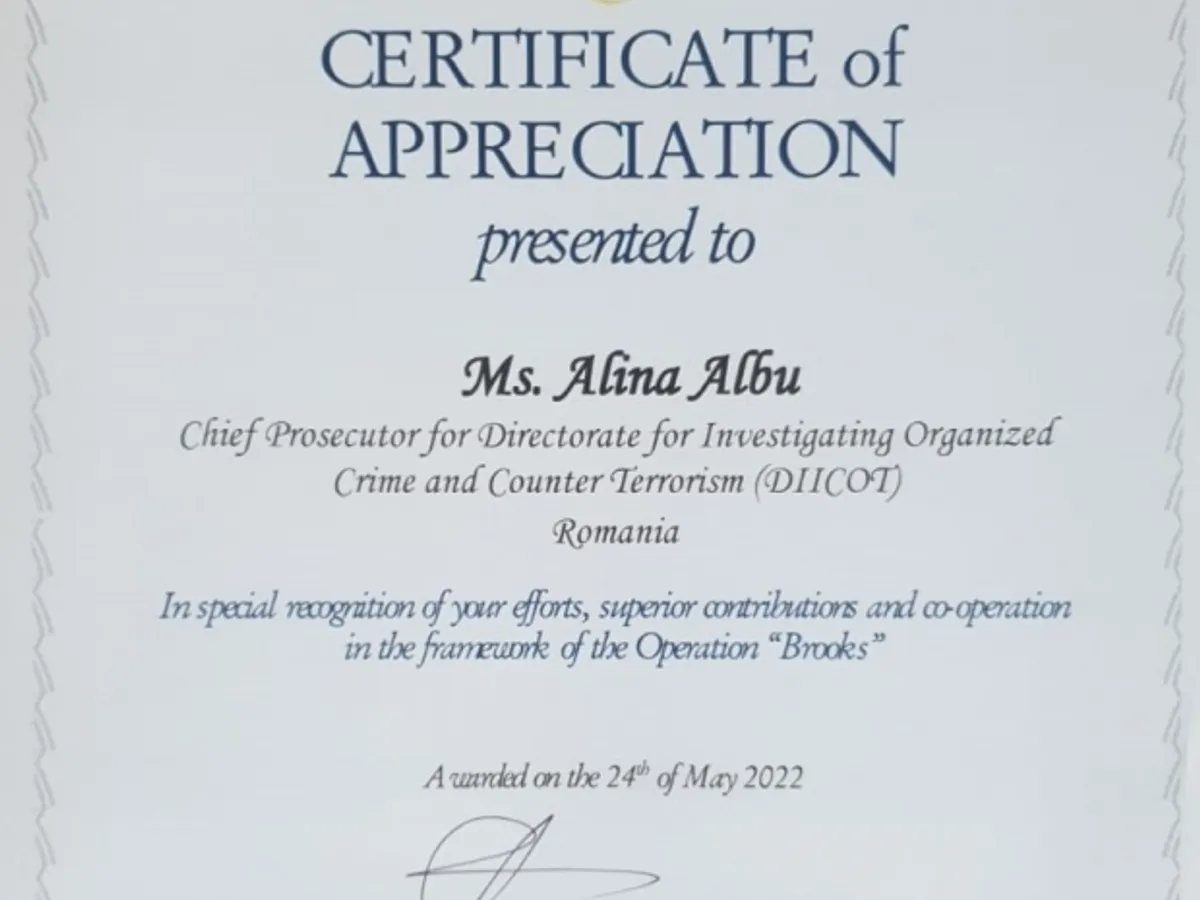 Ceremonia a avut loc marți, 24 mai 2022, la sediul Europol din Haga. Adjunctul șefului Departamentului de Combatere a Criminalității Organizate din cadrul Europol i-a acordat Alinei Albu o diplomă de excelență ca recunoaștere a competențelor și bunei colaborări cu Europol în celebrul dosar „Operațiunea Brooks”.