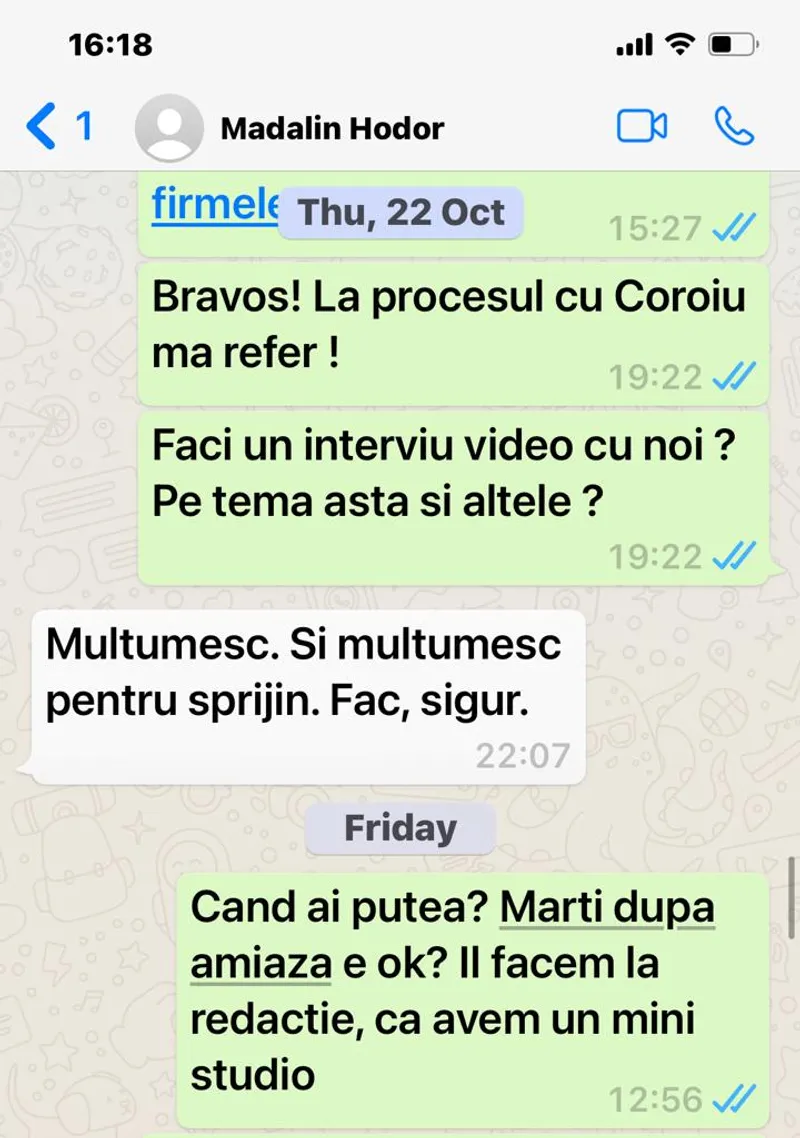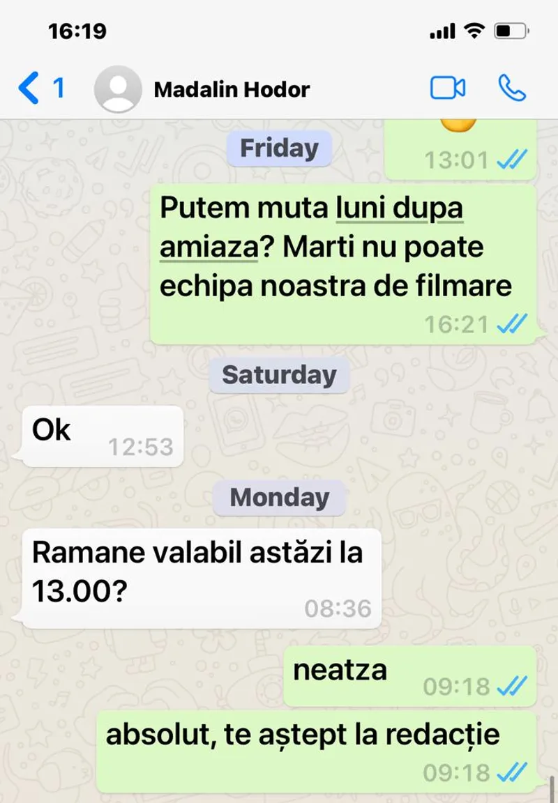 Vineri, 23 octombrie, după ora 16.00. Îi scriu din nou lui Mădălin Hodor și îl rog să devansăm interviul pentru luni după-amiază, întrucât echipa de filmare este ocupată în ziua următoare. Zis și făcut.