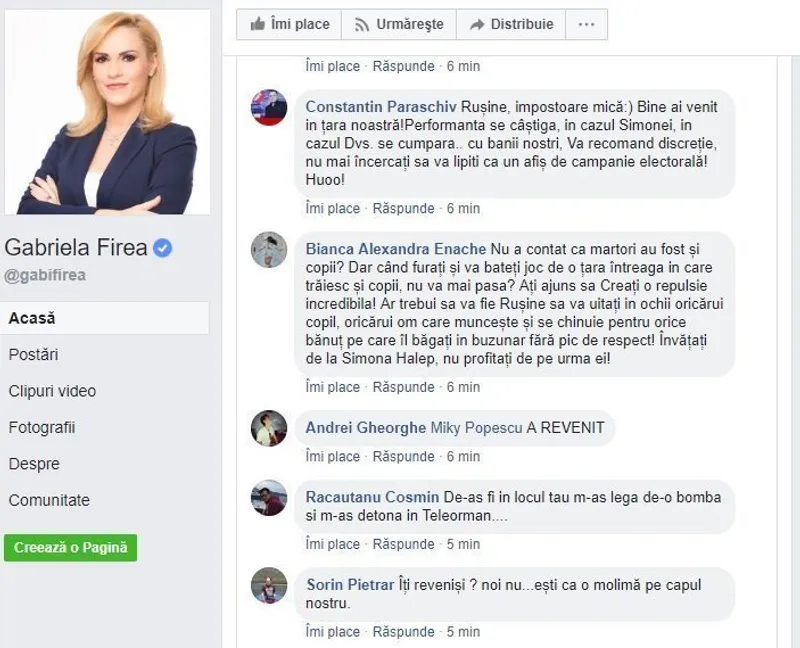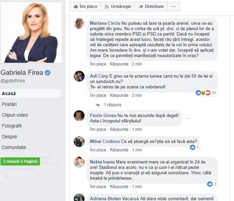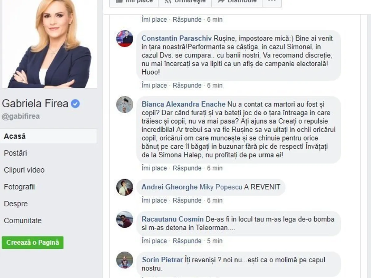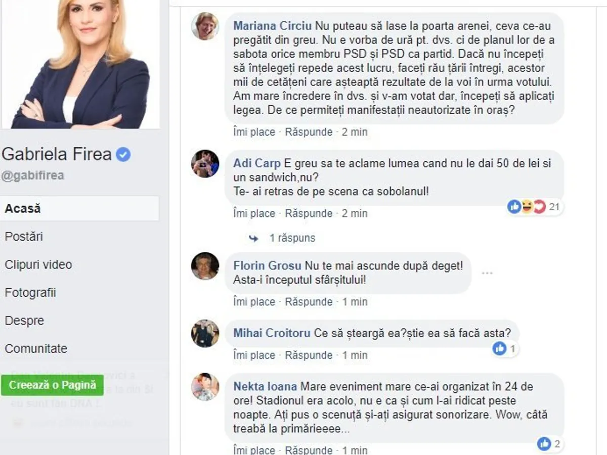Imediat, pagina sa de FB a fost asaltată de peste 10.000 de comentarii critice, în care oamenii fie o ironizau, fie îi băteau obrazul pentru gestul de pe stadion și pentru articolul postat. Așa încât, luni noapte, Gabriela Firea și-a închis pagina de Facebook.