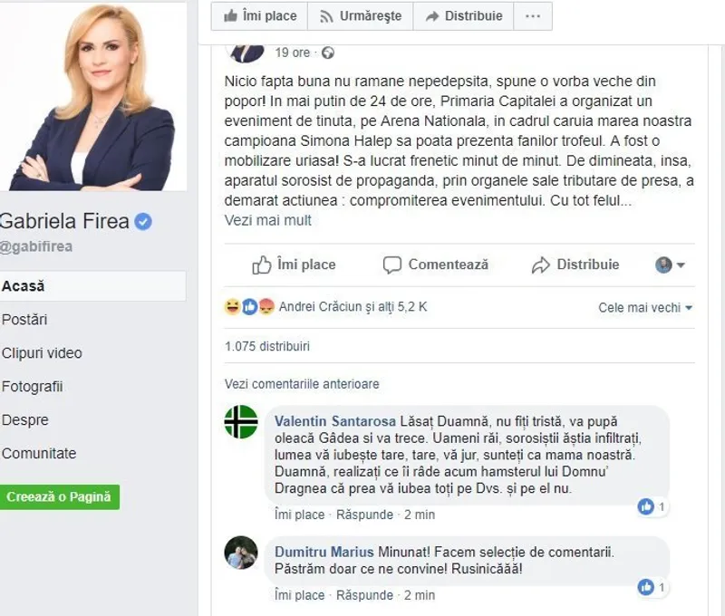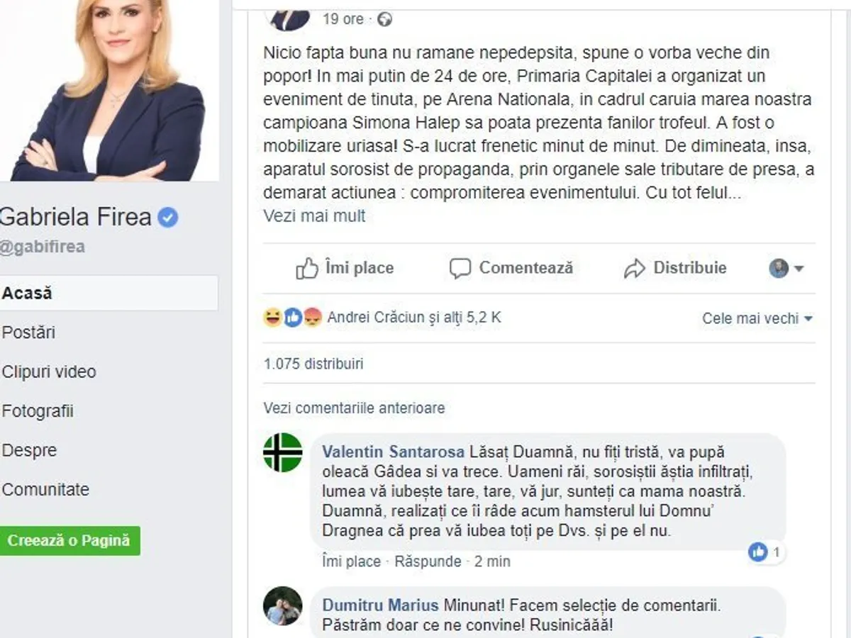 Marți, la ora 16.00, primărița Capitalei și-a redeschis pagina, cu postarea curățată de miile de comentarii negative. Dar, deși inițial au apărut doar cele pozitive (circa 180), comentatorii au reînceput să o critice pentru încercarea de se lipi de gloria Simonei Halep.