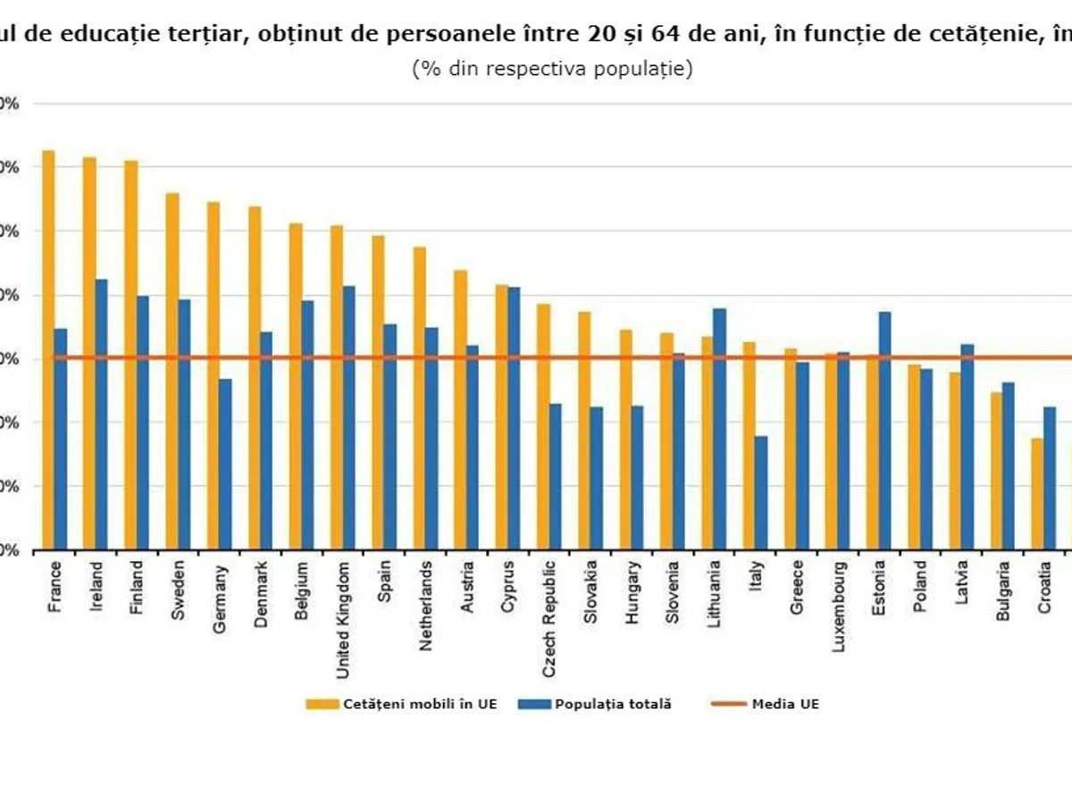 În schimb, potrivit datelor Eurostat, românii cu studii superioare – pregătire terțiară – au evitat să plece din țară. Doar 18% din cei care au ales să emigreze au terminat o facultate. În schimb, peste 60% din francezii care au migrat în spațiul UE au studii superioare.