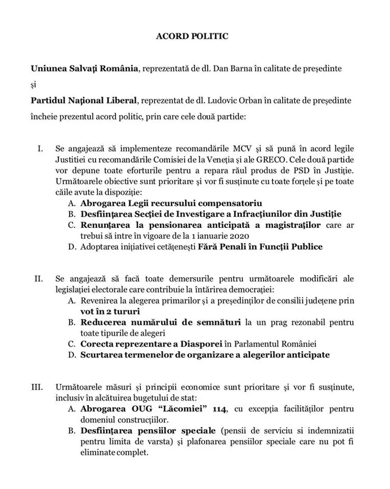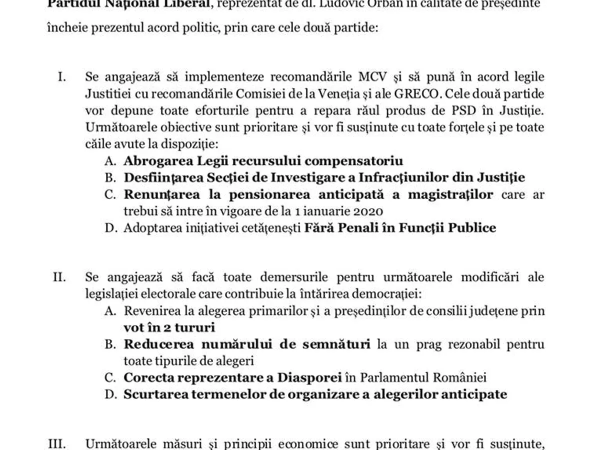 Un proiect de acord politic între PNL și USR prevede o serie de obiective comune pe care cele două partide să le susțină. Printre acestea se află revenirea la alegerea primarilor în două tururi sau desființarea secției speciale de investigare a magistraților.