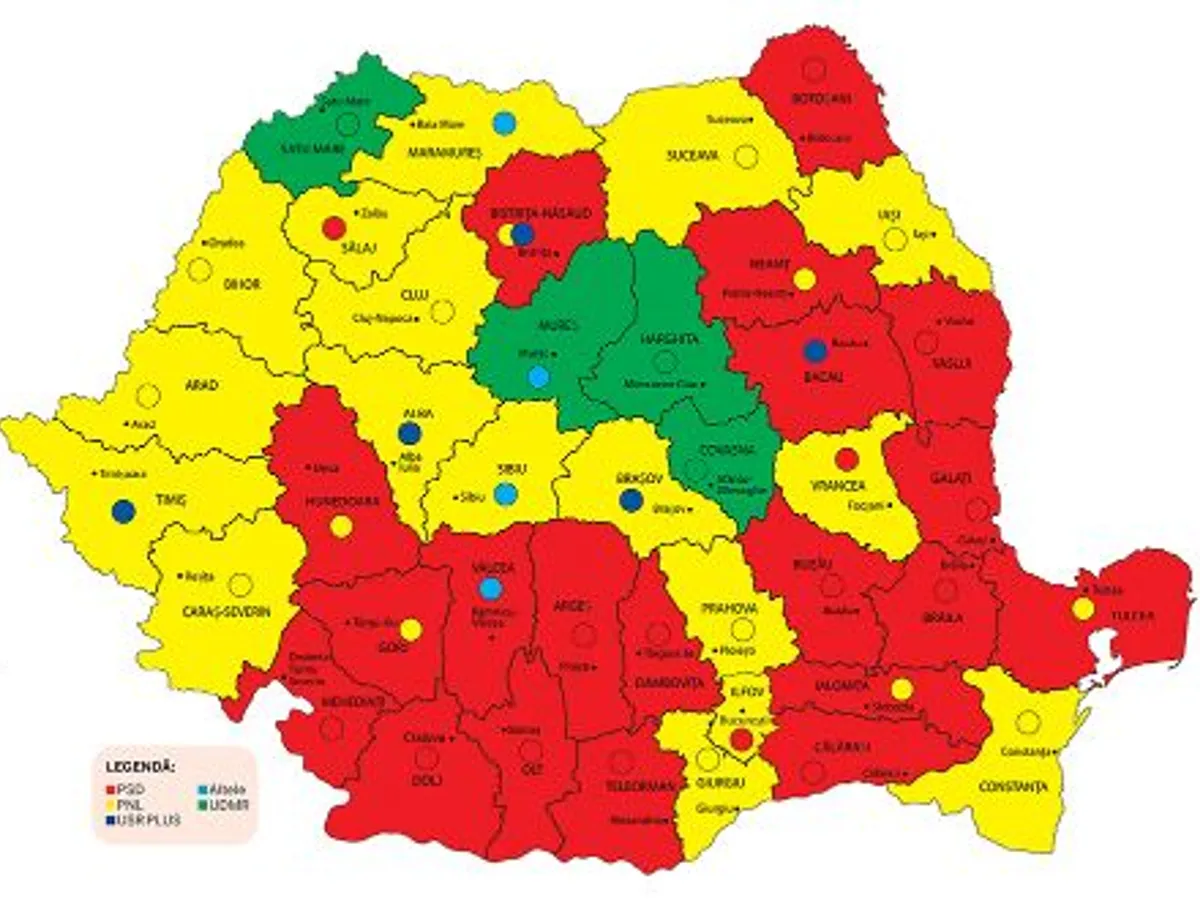 PNL a sărit de la opt, în 2016, la 17 președinți de consilii județene. UDMR va avea patru președinți față de cinci, în 2016. Formațiunea lui Kelemen Hunor a pierdut Bihorul, unde a câștigat la un scor zdrobitor liberalul Ilie Bolojan.