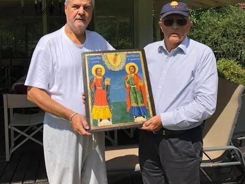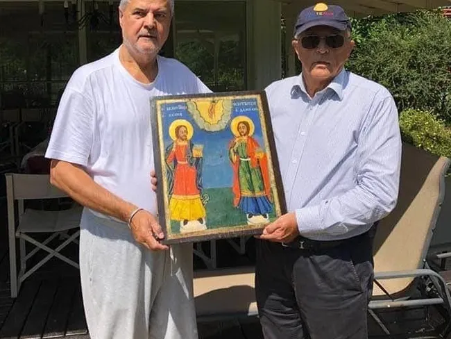 Cei doi țin în mâna o icoană, cadou pe care Năstase i l-a dăruit oaspetelui său.