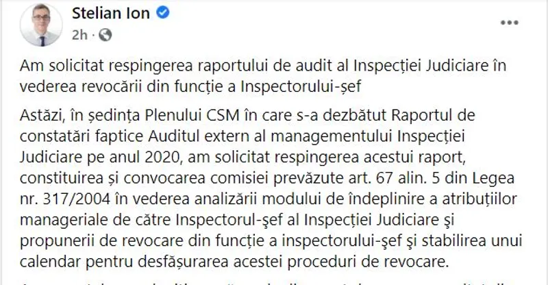 „Am solicitat respingerea raportului de audit al Inspecției Judiciare în vederea revocării din funcție a Inspectorului-șef. Astăzi, în ședința Plenului CSM în care s-a dezbătut Raportul de constatări faptice Auditul extern al managementului Inspecției Judiciare pe anul 2020, am solicitat respingerea acestui raport, constituirea și convocarea comisiei prevăzute art. 67 alin. 5 din Legea nr. 317/2004 în vederea analizării modului de îndeplinire a atribuțiilor manageriale de către Inspectorul-şef al Inspecției Judiciare şi propunerii de revocare din funcție a inspectorului-şef şi stabilirea unui calendar pentru desfășurarea acestei proceduri de revocare.”