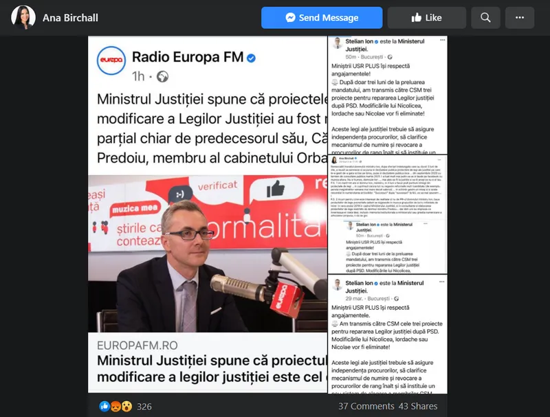 „Ce vă spuneam că dl ministru Stelian Ion nu e departe de "performanțele" unuia din predecesorii săi, și anume "savantul de renume mondial" Tudorel Toader? Iată cum actualul ministru Ion calcă exact pe urmele lui TT, modificându-și postările pe măsură ce își revizuiește și atitudinea cu privire la diverse subiecte. Doar că fostul ministru dl. TT își ștergea postările după o oră, iar actualul ministru, dl. Ion, doar le modifică (semnificativ) conținutul după... ceva mai mult timp, dupa ce este prins cu minciunica!”, scrie Ana Birchall pe Facebook.