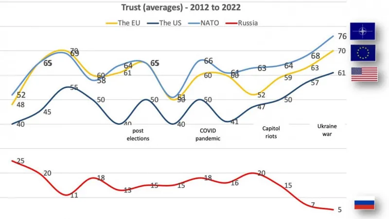 Remarcabil este că, după doi ani de amplificare a atitudinilor populiste, în ultima lună există o revenire la scorurile din perioada pre-pandemică. Un element ce poate explica această evoluție este începerea războiului din Ucraina, care a determinat un tip de precauție în rândul publicului din România, în legătură cu acest tip de discurs. Mai mult, un alt efect important al ultimelor luni a fost creșterea încrederii în Vest (UE, NATO, SUA) și scăderea majoră a încrederii în Rusia (sursa principală de dezinformare în regiune).