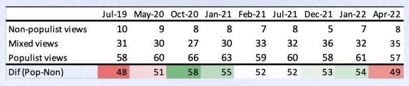 Cifrele sondajelor CPD arată că publicul cu atitudini populiste a avut cea mai mare pondere chiar în luna de campanie electorala (din octombrie 2020), cu alte momente de creștere pe parcursul părții a doua a anului 2021. Ulterior, însă, ponderea publicului populist a reînceput să scadă.