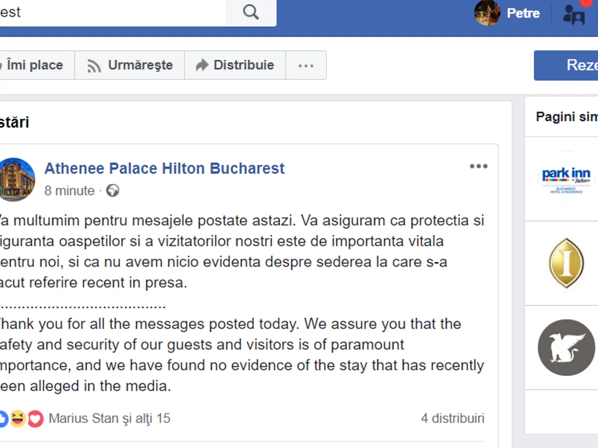 „Va multumim pentru mesajele postate astazi. Va asiguram ca protectia si siguranta oaspetilor si a vizitatorilor nostri este de importanta vitala pentru noi, si ca nu avem nicio evidenta despre sederea la care s-a facut referire recent in presa”, a postat Athenee Palace Hilton Bucharest pe pagina de Facebook.