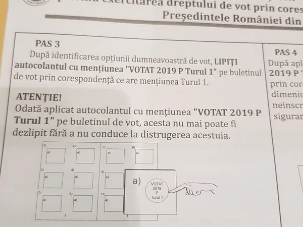 Un român stabilit la Londra a publicat pe Facebook imagini cu autocolantele cu mențiunea „Votat”, folosite la votul prin corespondență, care pot fi ușor dezlipite și relipite în căsuța unui alt candidat la alegerile prezidențiale.