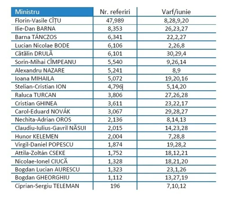 Datele rezultă din „Barometrul vizibilităţii miniştrilor”, o analiză realizată de News.ro şi de Agenţia de monitorizare Klarmedia, pe baza monitorizării presei scrise şi online.
