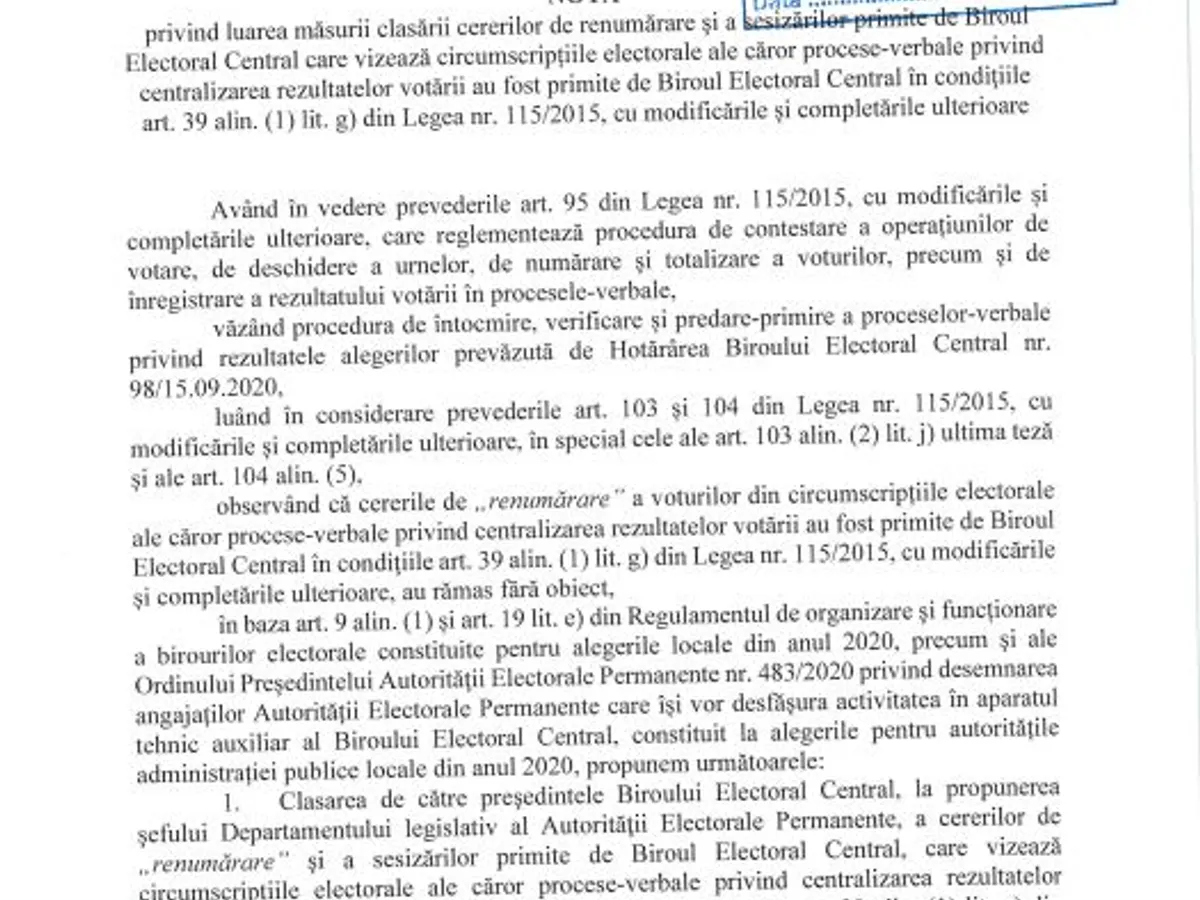 Astfel, BEC a emis o notă „privind luarea măsurii clasării cererilor de renumărare şi a sesizărilor primite de Biroul Electoral Central care vizează circumscripţiile electorale ale căror procese-verbale privind centralizarea rezultatelor votării au fost primite de Biroul Electoral Central în condiţiile art. 39 alin. (1) lit. g) din Legea 115/2015, cu modificările şi completările ulterioare”, potrivit News.ro.