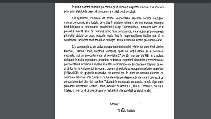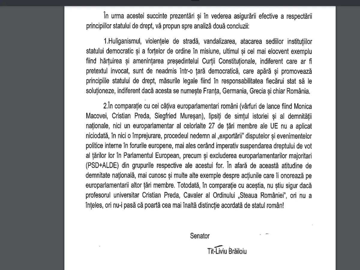Brăiloiu anunță indignat că, în octombrie se va dezbate în Parlamentul European „așa-zisa situație a statului de drept din România” generată de evenimentele din 10 august. Când, spune Brăiloiu, violențele au fost anunțate anterior „și provocate cu bună știință, dar nedemn aruncate în sarcina diasporei” (cine le-a provocat, desigur nu PSD, – asta nu mai zice Brăiloiu). Care PSD vrea să elucideze misterul și a făcut o comisie de anchetă.