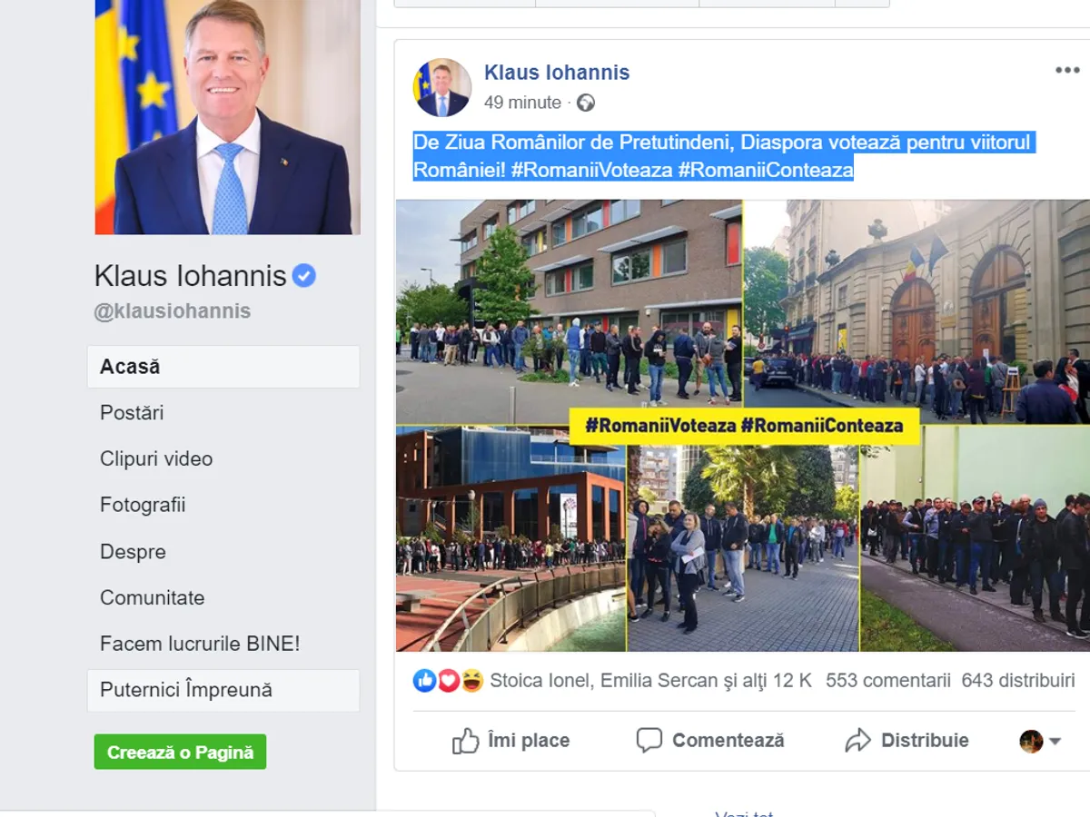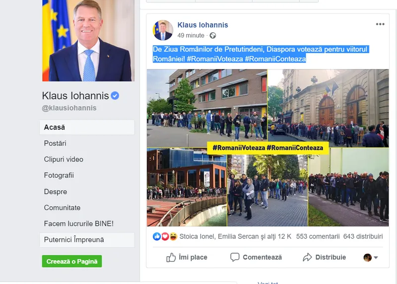 „De Ziua Românilor de Pretutindeni, Diaspora votează pentru viitorul României! #RomaniiVoteaza #RomaniiConteaza ”, a scris președintele care a adăugat un colaj de imagini cu românii din străinătate care stau la coadă pentru a vota.
