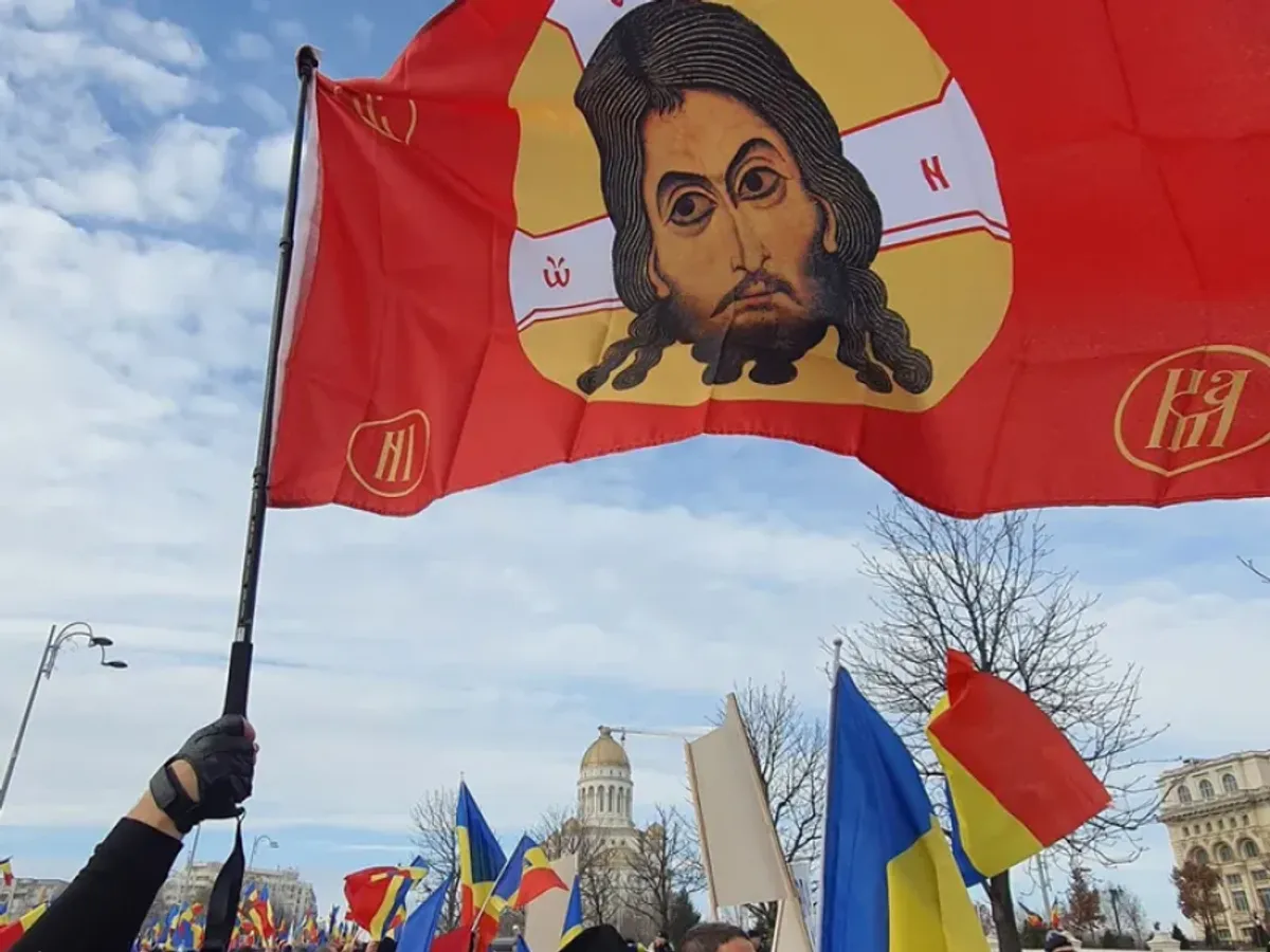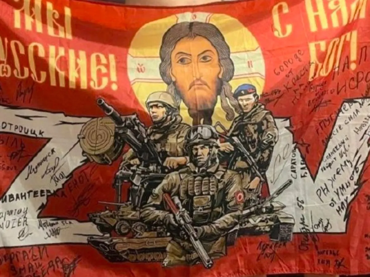 Însă, în mijlocul mulțimii, flutura un steag cu semnificație controversată: drapelul religios transformat în simbol de război de armata rusă, folosit de Kremlin pentru a justifica invazia sângeroasă din Ucraina.