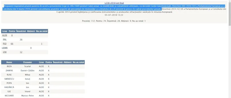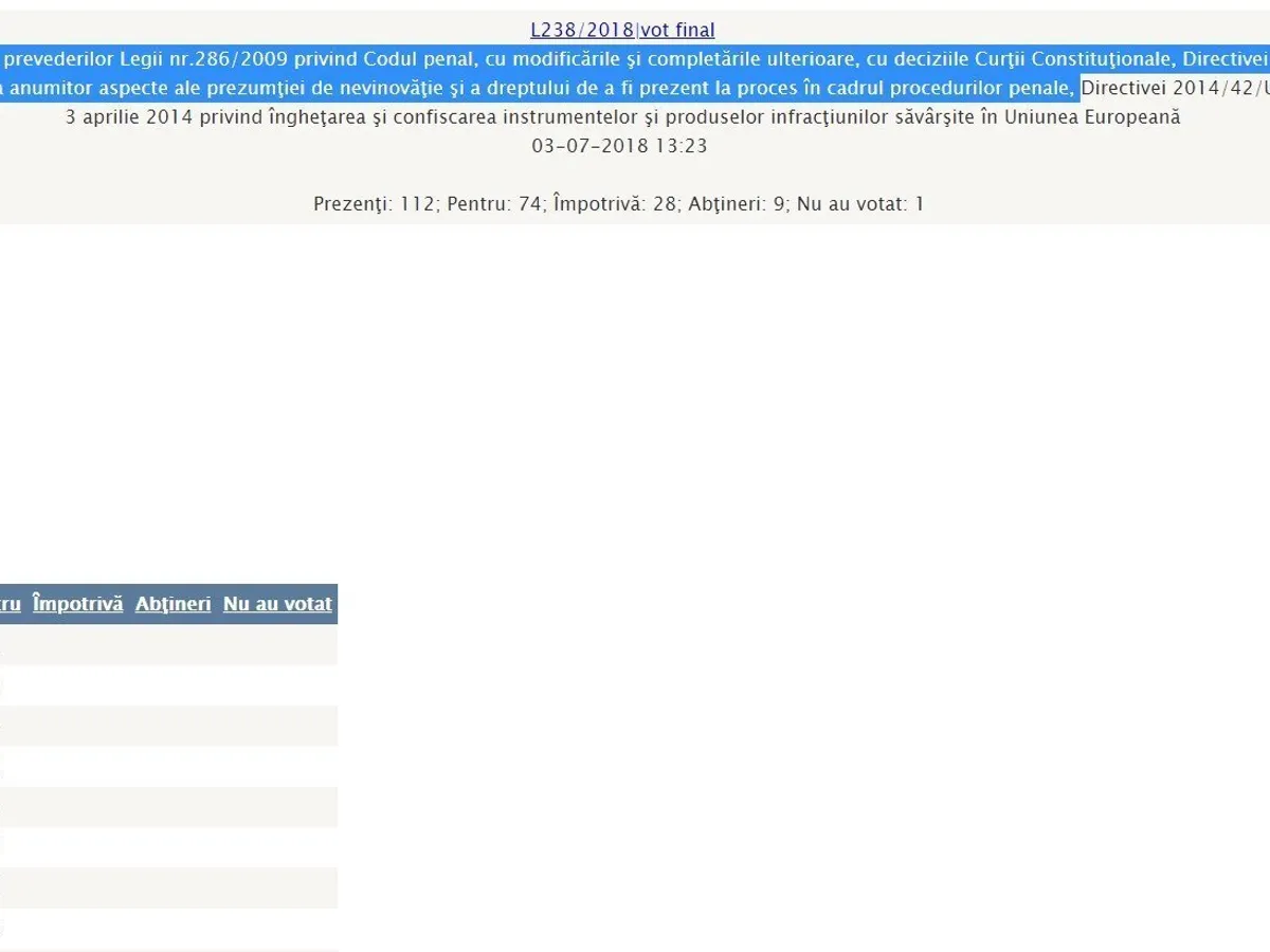 Pe data de 3 iulie Senatul a votat Propunere legislativă privind punerea în acord a prevederilor Legii nr.286/2009 privind Codul penal cu deciziile Curţii Constituţionale, Directivei (UE) 2016/343 a Parlamentului European şi a Consiliului din 9 martie 2016 privind consolidarea anumitor aspecte ale prezumţiei de nevinovăţie şi a dreptului de a fi prezent la proces în cadrul procedurilor penale.