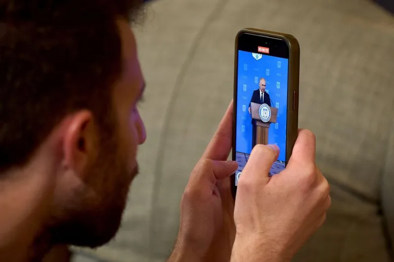 Un jurnalist înregistrează pe telefonul său conferinţa de presă a preşedintelui ad-interim Ilie Bolojan - Foto: Profimedia Images