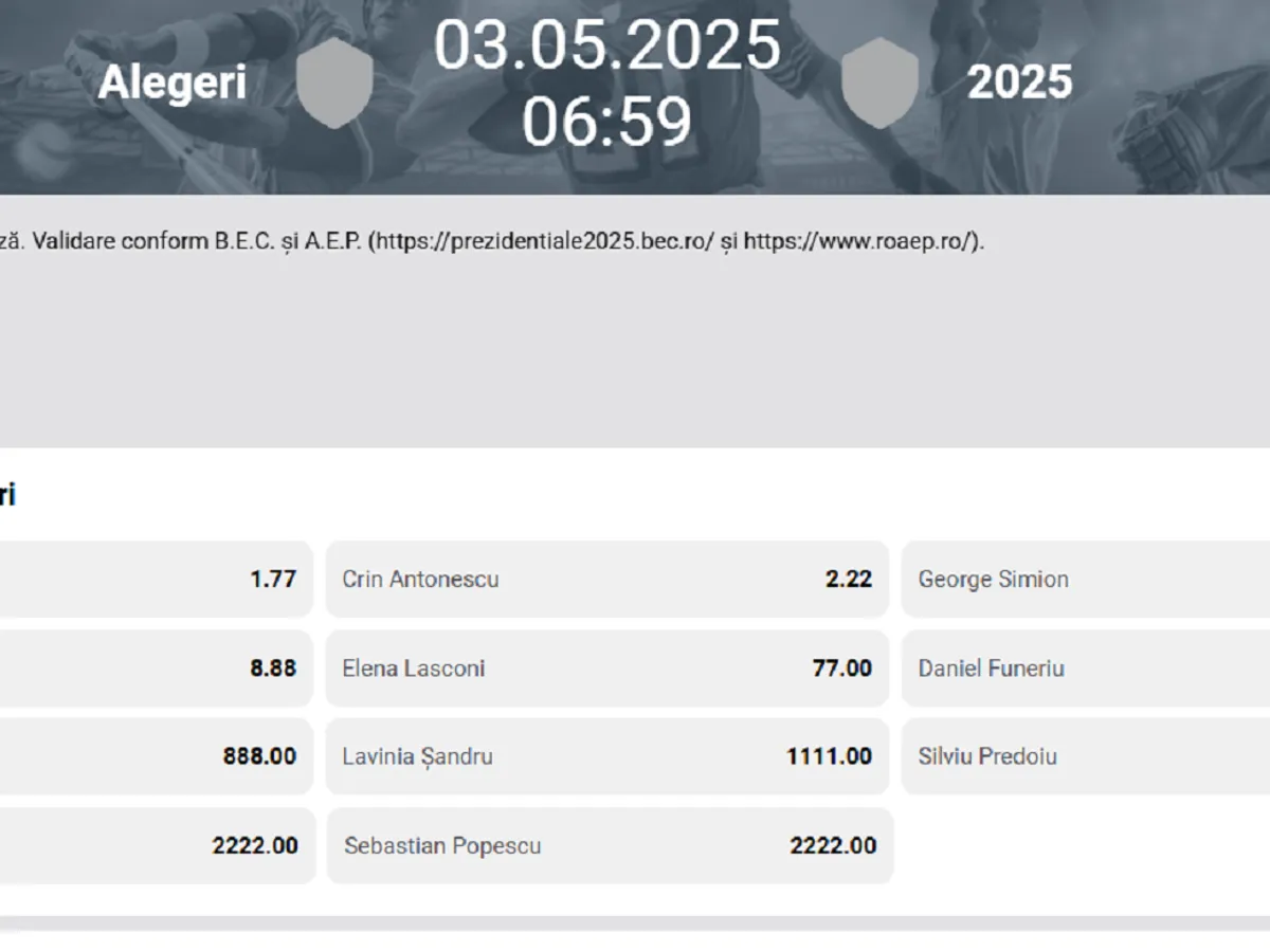 Casele de Pariuri cred că George Simion va ajunge în turul al doilea (cotă de 1,22/1). Cu cât cotele sunt mai mici, cu atât șansele sunt mai mari.