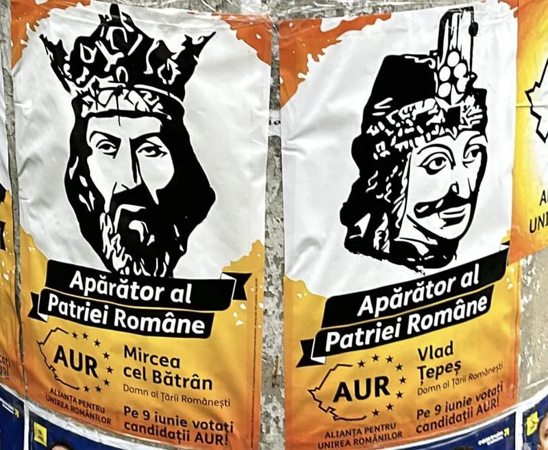 De pe panourile electorale, dar și pe cele agățate pe blocurile din Capitală și din alte orașe mari ale României, te îndeamnă să votezi AUR figuri istorice pecum Vlad Țepeș, Mihai Viteazul, Mircea cel Bătrân sau Constantin Brâncoveanu.