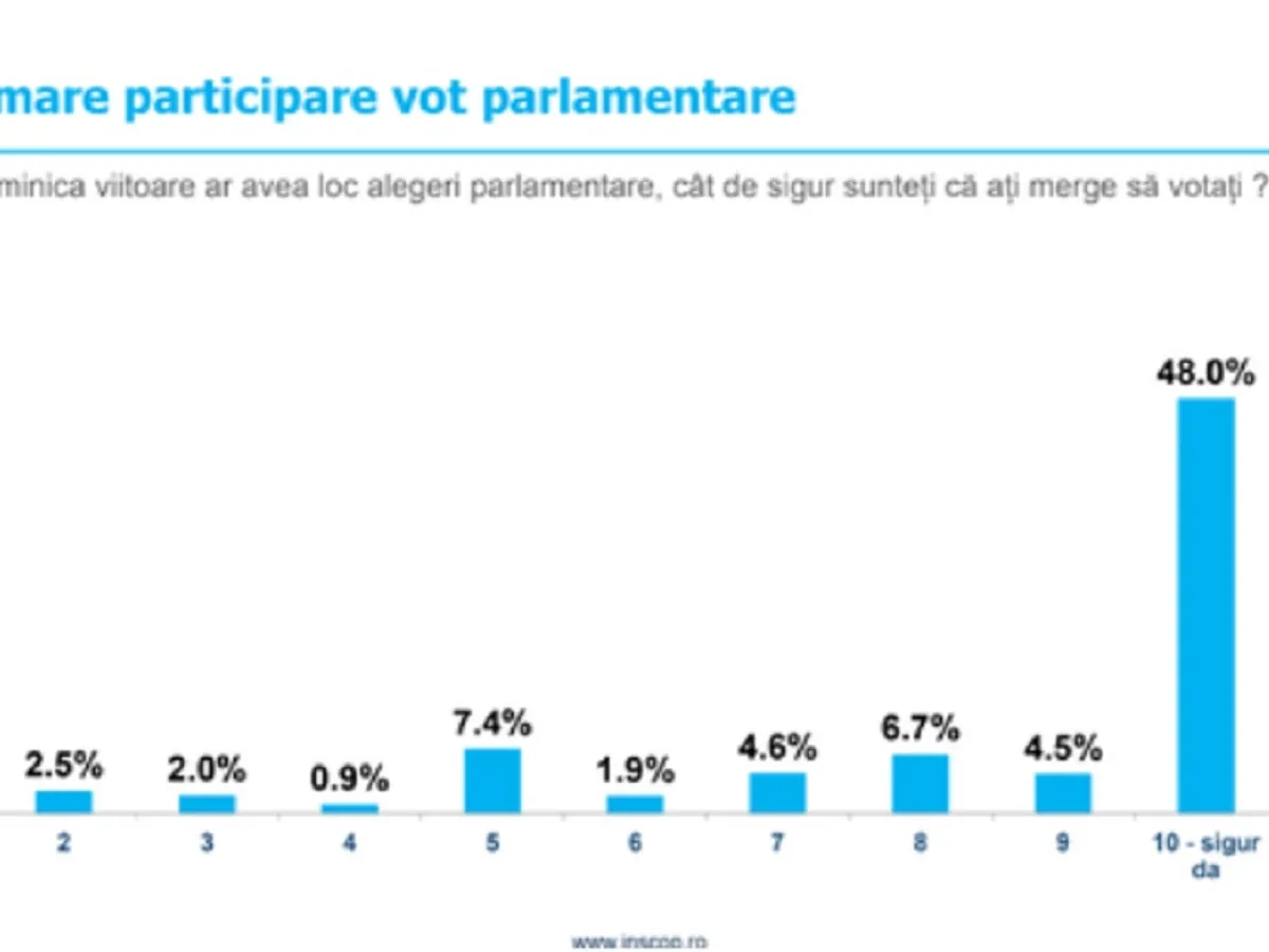 Pe o scară de la 1 la 10, în care 1 înseamnă că ”sigur nu” voi merge la vot şi 10 ”sigur da” voi merge la vot, 20,5% dintre români au ales 1, 2,5% au ales 2, 2% au ales 3, 0,9% au ales 4, 7,4% au ales 5, 1,9% au ales 6, 4,6% au ales 7. 6,7% indică 8, 4,5% 9 şi 48% indică 10. 1,1% reprezintă procentul non-răspunsurilor.