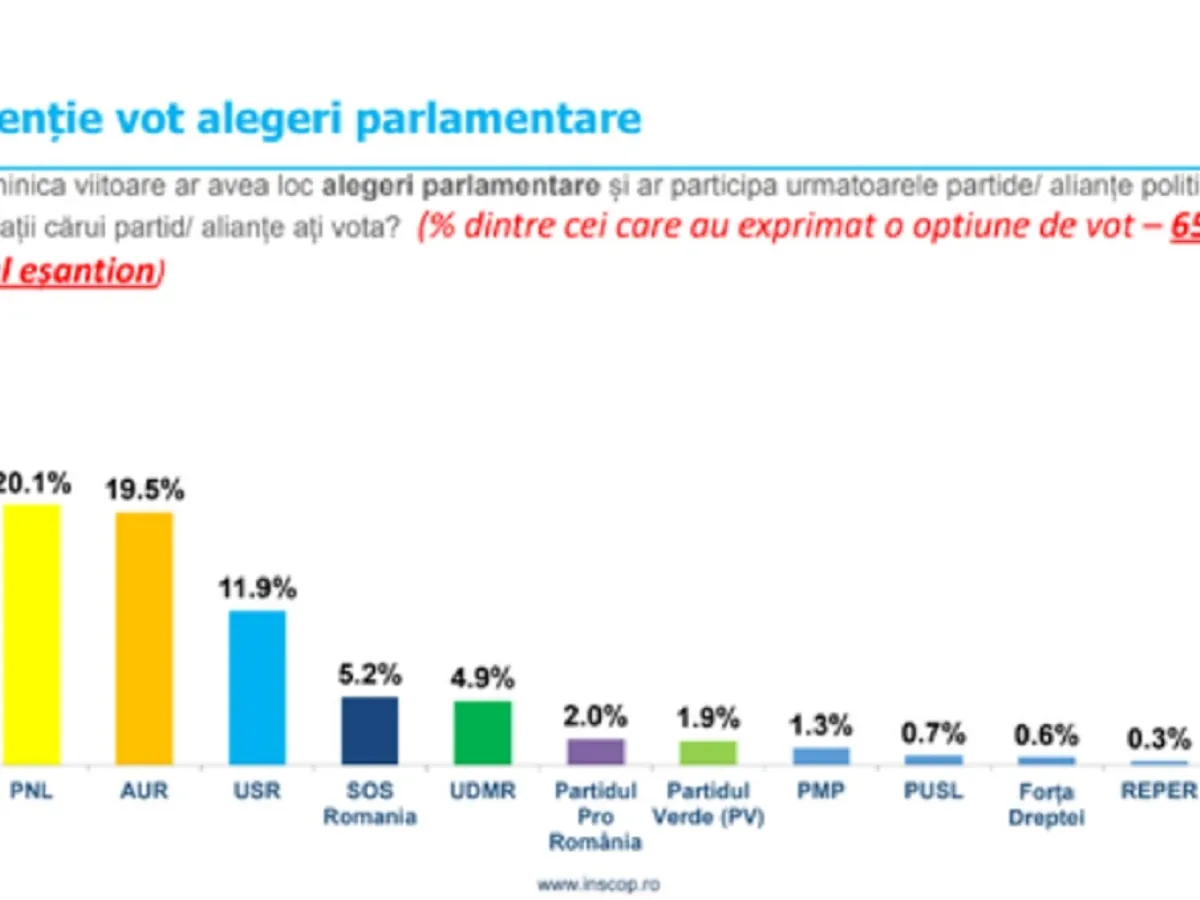 Astfel, PSD ar obţine 30,2% din voturi, PNL - 20,1%, AUR - 19,5%, iar partidul Dianei Şoşoacă, S.O.S., ar trece de pragul de 5% necesar intrării în Parlament, dacă duminică ar avea loc alegeri parlamentare.