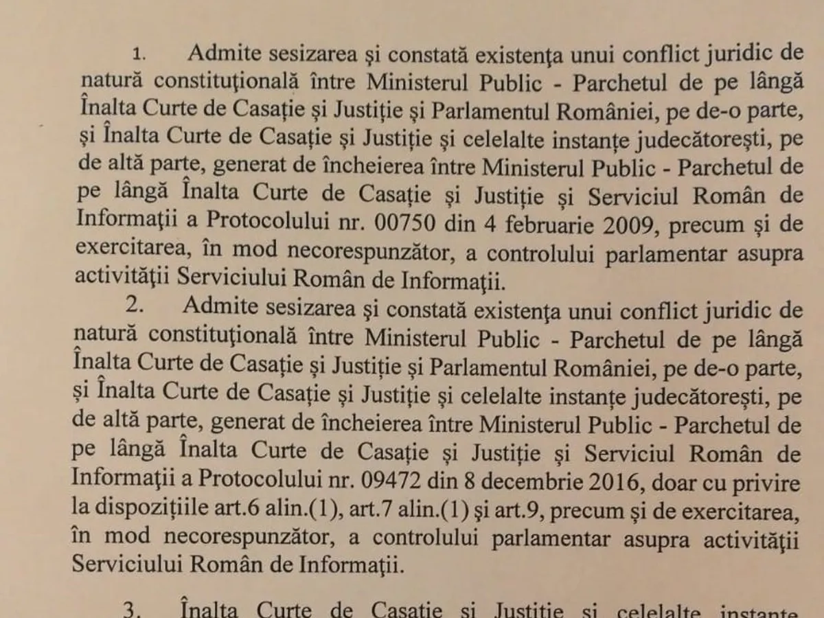CCR a admis, miercuri, sesizarea preşedintelui Camerei Deputaţilor referitoare la existenţa unui conflict juridic între Ministerul Public şi Parlament, Înalta Curte de Casaţie şi Justiţie şi celelalte instanţe judecătoreşti pe tema protocoalelor de colaborare cu SRI.