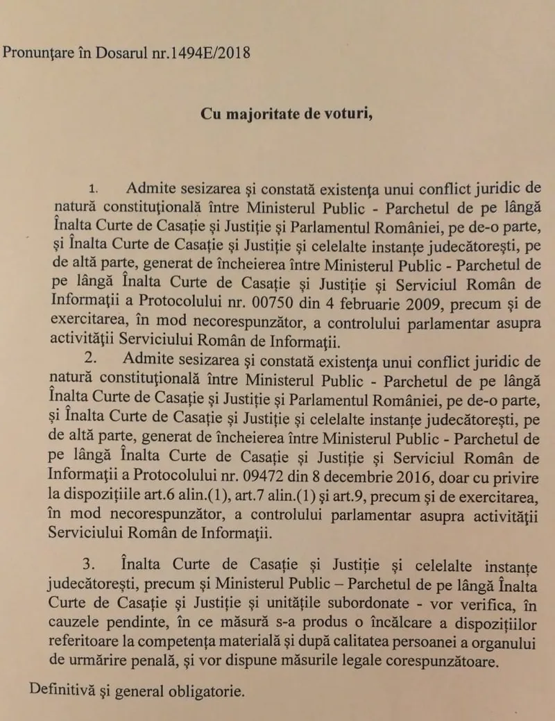 În ceea ce privește protocolul dintre Parchet și SRI încheiat în 2016 a fost declarat parțial neconstituțional, și anume art. 6 alineatul 1, art. 7 și articolul 9. Judecătorii au constatat că acest protocol are bază legală, fiind încheiat în temeiul unei ordonanțe de urgență.