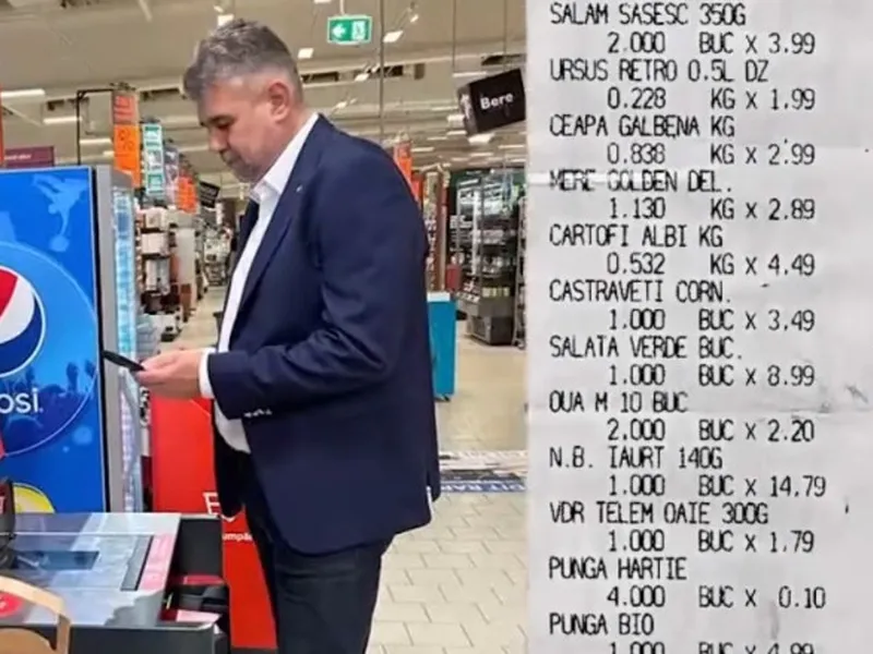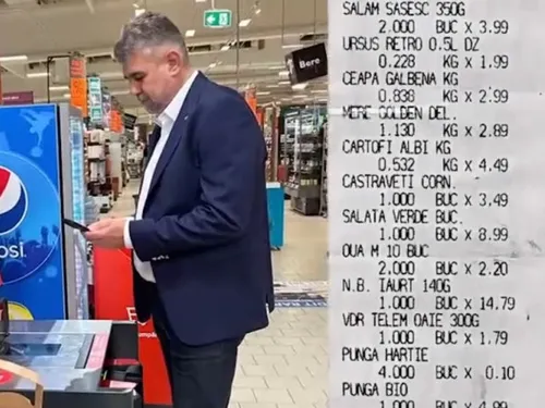 Marcel Ciolacu a transmis că a fost la cumpărături şi, cu suma de aproape 100 de lei, a luat ce avea nevoie. În coș avea o bere Ursus și un salam săsesc, printre alte produse.