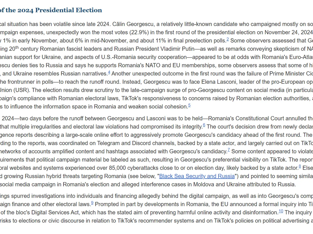 Rezultatele alegerilor au atras atenția asupra valului de conținut pro-Georgescu pe rețelele de socializare (în special TikTok) de la sfârșitul campaniei, asupra respectării de către campania lui Georgescu a legilor electorale românești, asupra reacției TikTok la preocupările exprimate de autoritățile electorale române și asupra acuzațiilor privind eforturile Rusiei de a influența spațiul informațional din România și de a slăbi coeziunea socială”, arată raportul care citează nu mai puțin de 103 surse.