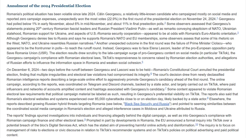 „Situația politică a României a fost volatilă de la sfârșitul anului 2024. Călin Georgescu, un candidat relativ puțin cunoscut, care și-a desfășurat campania în principal pe rețelele de socializare și nu a raportat cheltuieli de campanie, a obținut, în mod neașteptat, cele mai multe voturi (22,9 %) în primul tur al alegerilor prezidențiale din 24 noiembrie 2024.