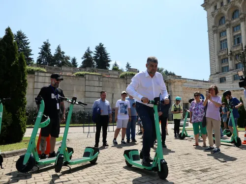 Președintele PSD Marcel Ciolacu a mers cu trotineta în curtea Palatului Parlamentului, miercuri, de Ziua Copilului.