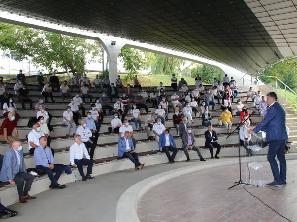 Într-o altă poză (foto de deschidere), Ciolacu se adresează, la microfon, unei săli pline de oameni. De asemenea, nu poartă mască. Ciolacu se adresează de la același microfon de la care a vorbit Florin Florian depistat cu COVID.