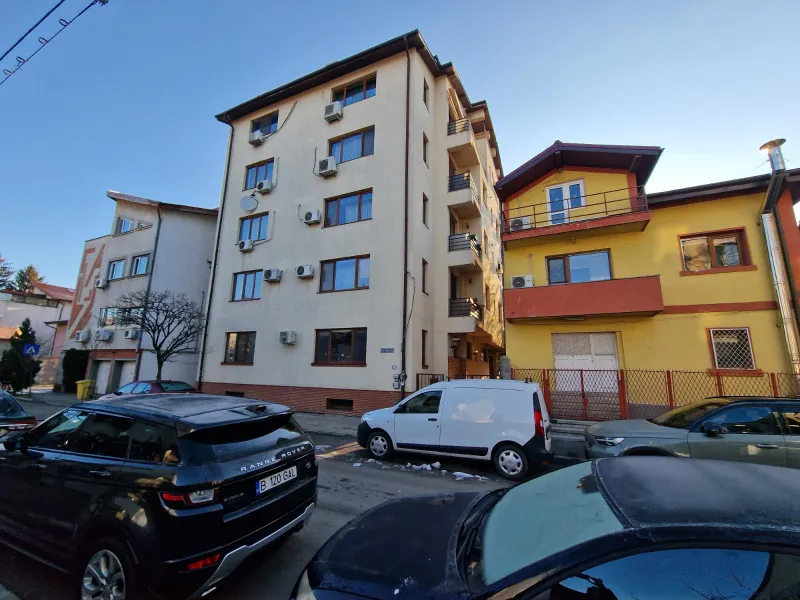 Pe pe strada Carol Knappe la numărul 24-26 se află un bloc înghesuit între două case.