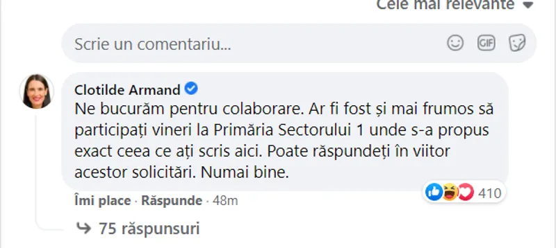 „Ne bucurăm pentru colaborare. Ar fi fost și mai frumos să participați vineri la Primăria Sectorului 1 unde s-a propus exact ceea ce ați scris aici. Poate răspundeți în viitor acestor solicitări. Numai bine”, a menționat primarul Sectorului 1.