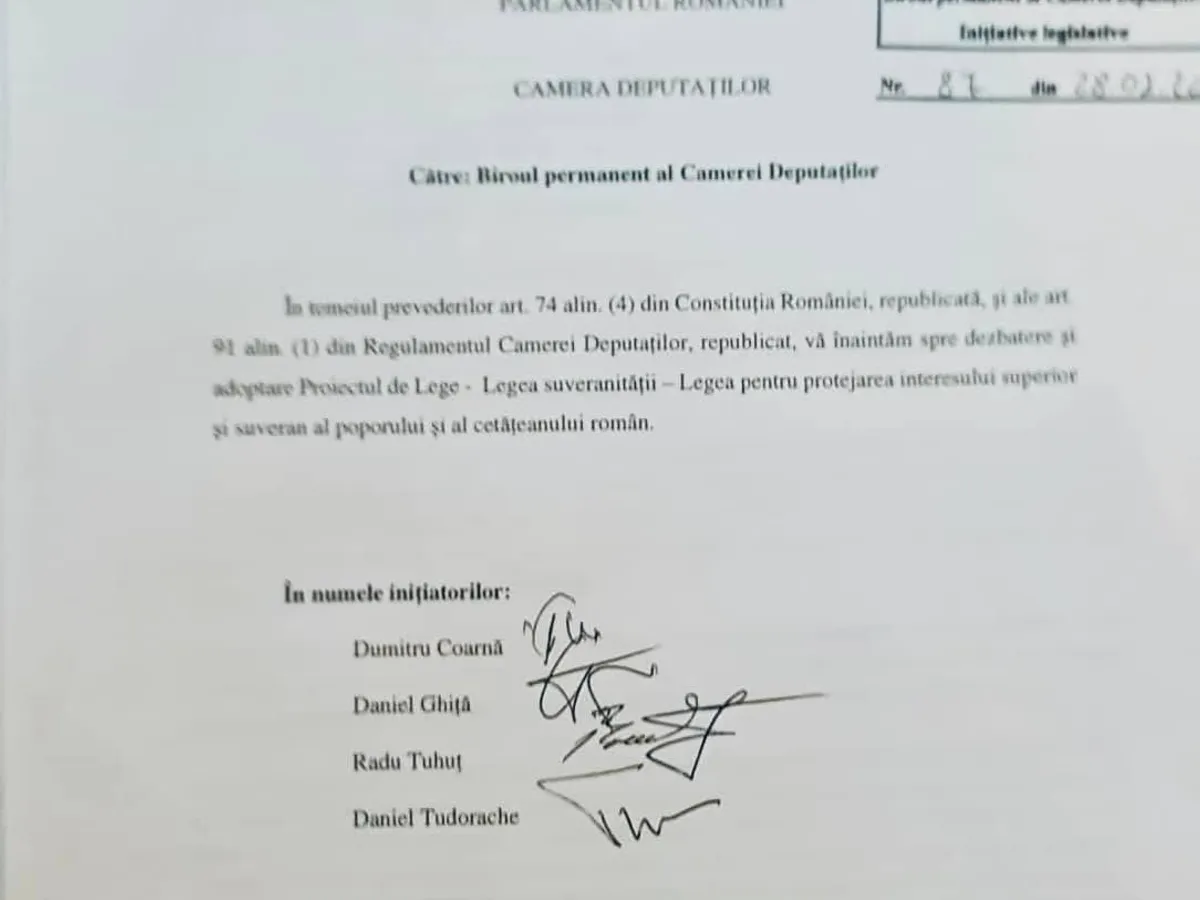 În temeiul prevederilor articolului 74 aliniatul 4 din Constituția României și ale articolului 91 aliniatul 1 din Regulamentul Camerei Deputaților vă înaintăm spre dezbatere și adoptare proiectul de lege – Legea Suveranității – Legea pentru protejarea interesului superior și suveran al poporului și al cetățeanului român”.
