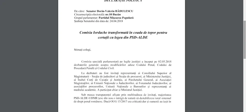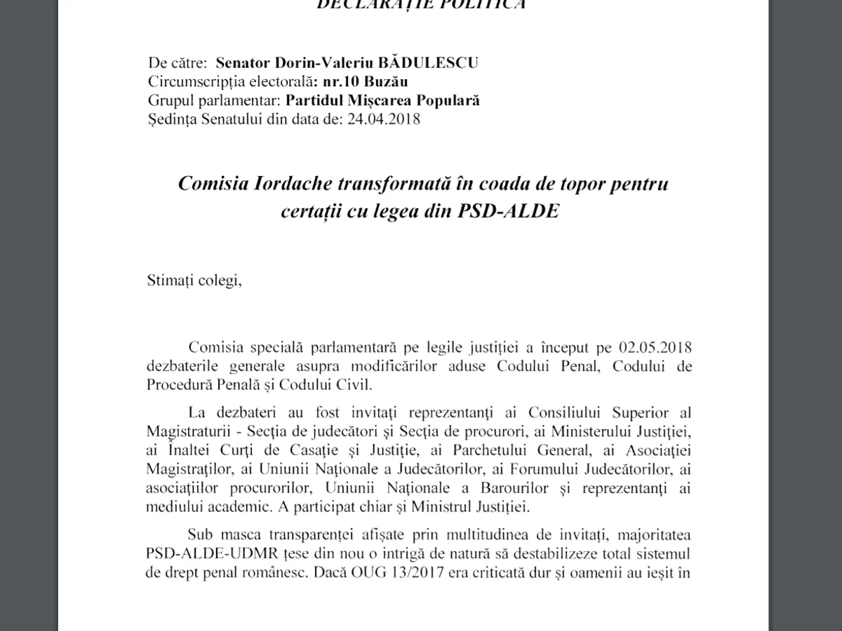 Pe 24 aprilie 2018, Bădulescu (tot senator PMP) acuza: „Comisia Iordache transfomată în coada de topot pentru certații cu legea din PSD-ALDE”. „Sub masca transparenței afișate, multitudinea de invitați, majoritatea PSD-ALDE-UDMR țese o intrigă de natură să destabilze total sistemul de drept penal românesc... proiectul de modificare este mult mai extins, iar impactul ei este al bombei de la Hiroșima”.