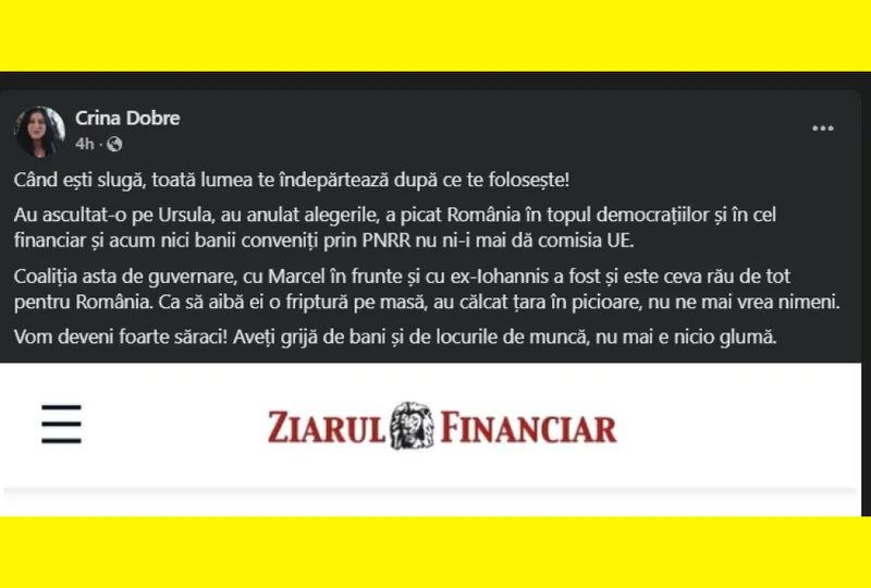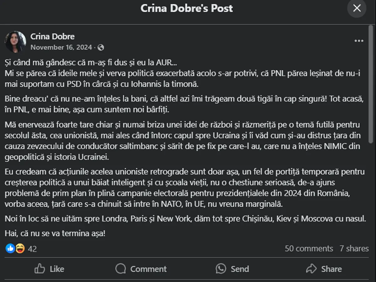 Iată ce mai scria Crina Dobre în urmă cu câteva zile pe pagina ei de Facebook.