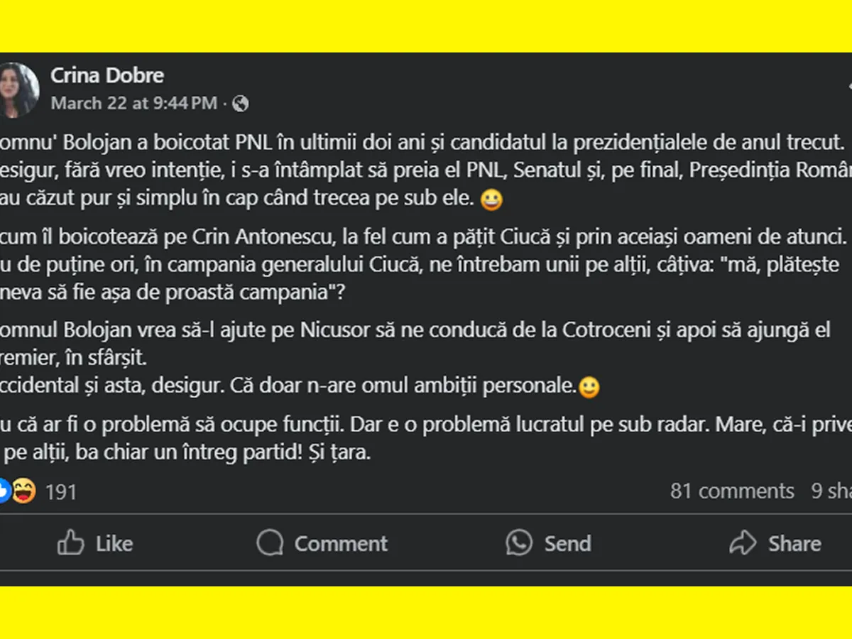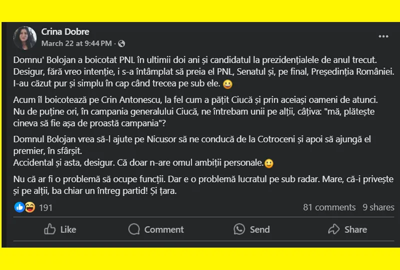 „Domnu' Bolojan a boicotat PNL în ultimii doi ani și candidatul la prezidențialele de anul trecut. Desigur, fără vreo intenție, i s-a întâmplat să preia el PNL, Senatul și, pe final, Președinția României. I-au căzut pur și simplu în cap când trecea pe sub ele.