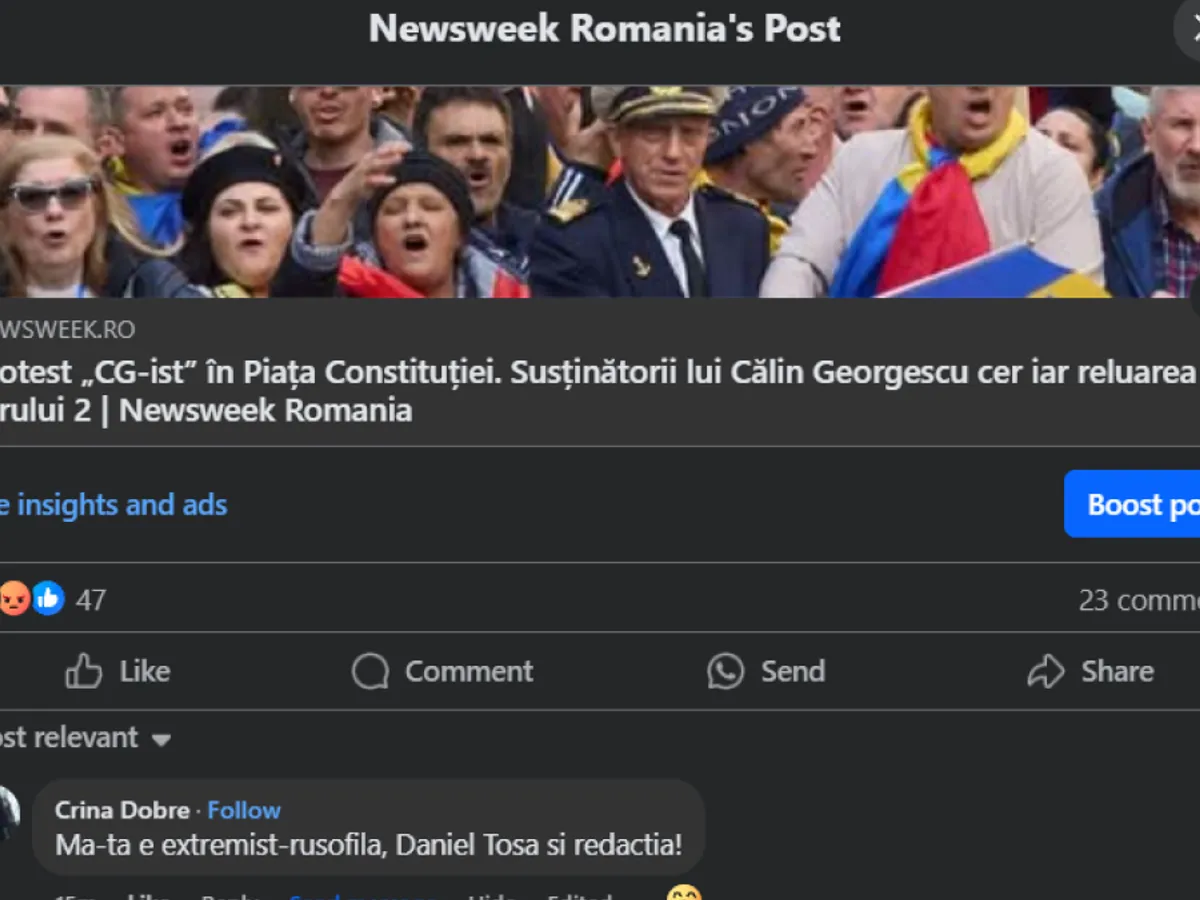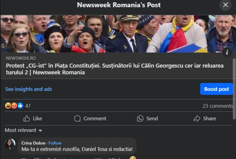 La o știre postată despre protestul organizat astăzi de extremiștii AUR pentru Călin Georgescu, candidatul aplaudat de Moscova, AUR-ista Crina Dobre și-a ieșit din minți și a început să înjure redacția Newsweek România.