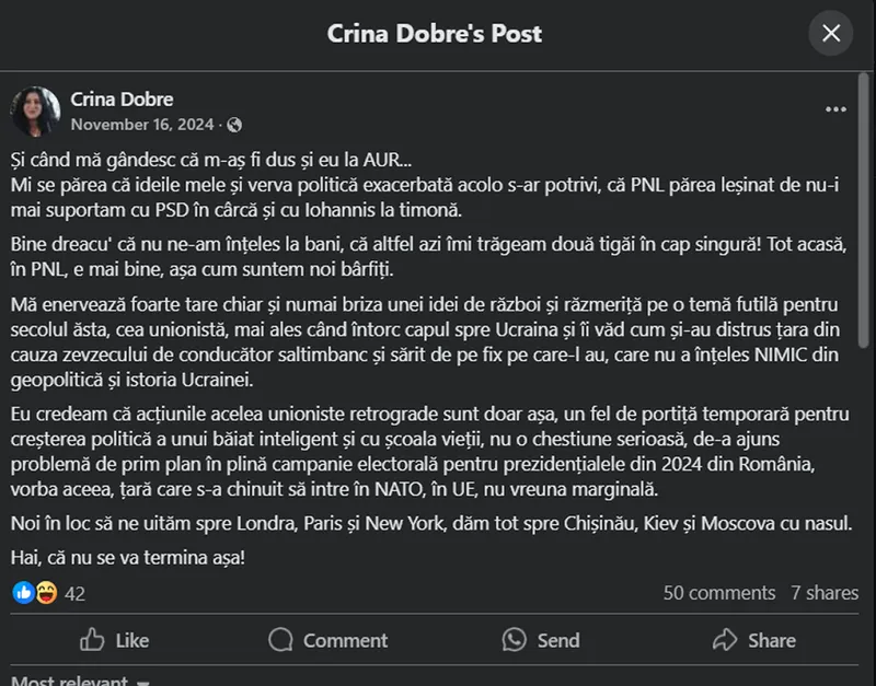 Nu că ar fi o problemă să ocupe funcții. Dar e o problemă lucratul pe sub radar. Mare, că-i privește și pe alții, ba chiar un întreg partid! Și țara”, scria Dobre pe Facebook.