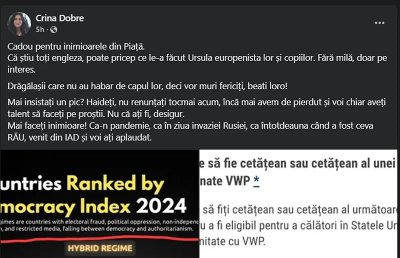 Nu de alta, dar pe unii ca voi, care prin atitudine și insistențe izvorâte ori din frici, ori pe bani, ați obligat oamenii să se vaccineze, să poarte mască, să sărăcească, să moară, să dea banii țării pentru războiul altora (afișați steagul țării în război la proteste și îi aclamați numele unuia care și-a ucis poporul pentru putere și bani, faceți coreografii pentru Ursula, gropara UE)...nu mai dau doi bani găuriți pe voi! Îmi pare rău că v-am cunoscut vreodată, mici satrapi încrucișați cu oaia”, scrie ea pe pagina ei de Facebook.