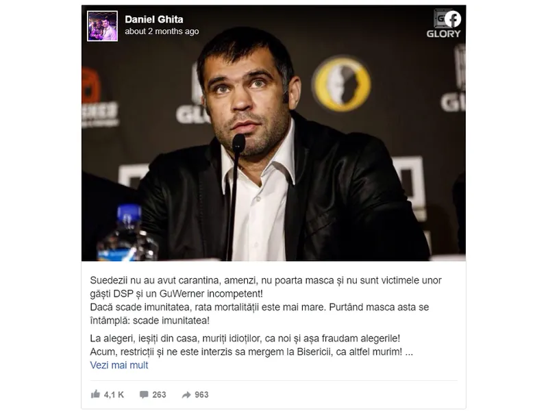 Fost luptător de K1, Daniel Ghiță s-a remarcat prin postările de pe Facebook în care a promovat teorii ale conspirației despre pandemia de COVID și a militat împotriva purtării măștii. Brusc, de când e deputat PSD, a încput să vadă COVID-ul.