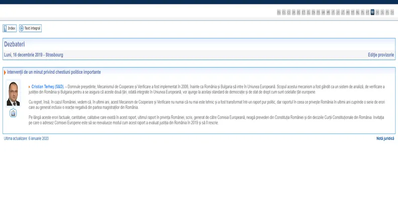 Cristian Terheş (europarlamentar S&D) a avut o declarație în plen, la Strasbourg: „Domnule președinte, Mecanismul de Cooperare și Verificare a fost implementat în 2006, înainte ca România și Bulgaria să intre în Uniunea Europeană. Scopul acestui mecanism a fost gândit ca un sistem de analiză, de verificare a justiției din România și Bulgaria pentru a se asigura că aceste două țări, odată integrate în Uniunea Europeană, vor ajunge la același standard de democrație și de stat de drept cum sunt celelalte țări europene.