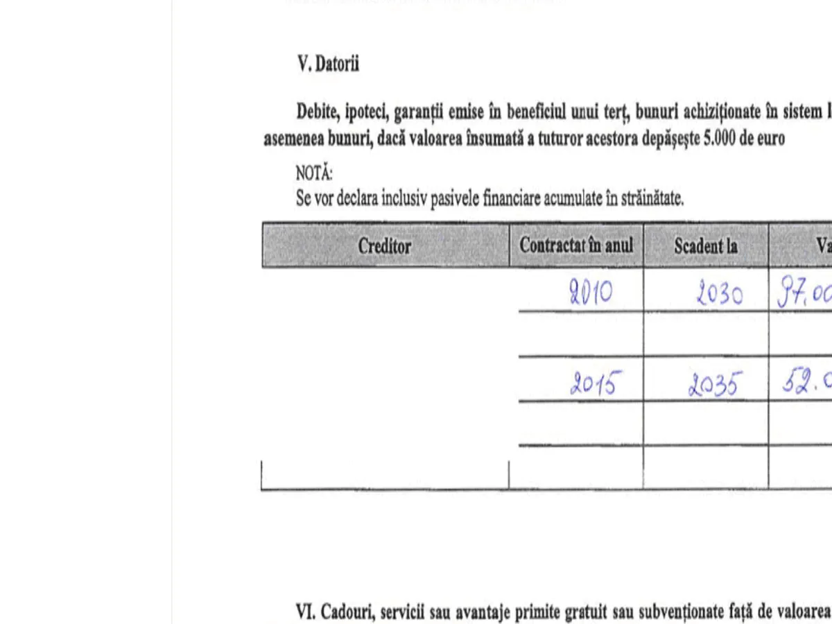 Un al doilea credit, luat în 2015, este în valoare de 52.000 euro. Tot fără dobânzi, deputatul AUR ar trebui să plătească o rată lunară de 215 euro. Nu se precizează la cine sunt făcute aceste datorii.