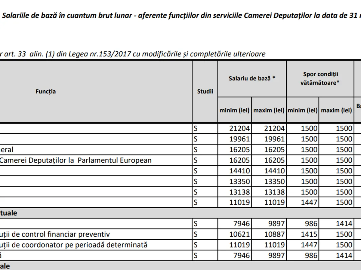 Au scăzut sporurile, dar numai pentru o mână de angajați: pentru directori și pentru câțiva șefi. Potrivit unui document al Parlamentului României, datat 31 martie, putem observa că secretarul instituției are un salariu brut de 21.200 de lei, în creștere cu 1.000 de lei față de anul trecut când câștiga 20.100 de lei.