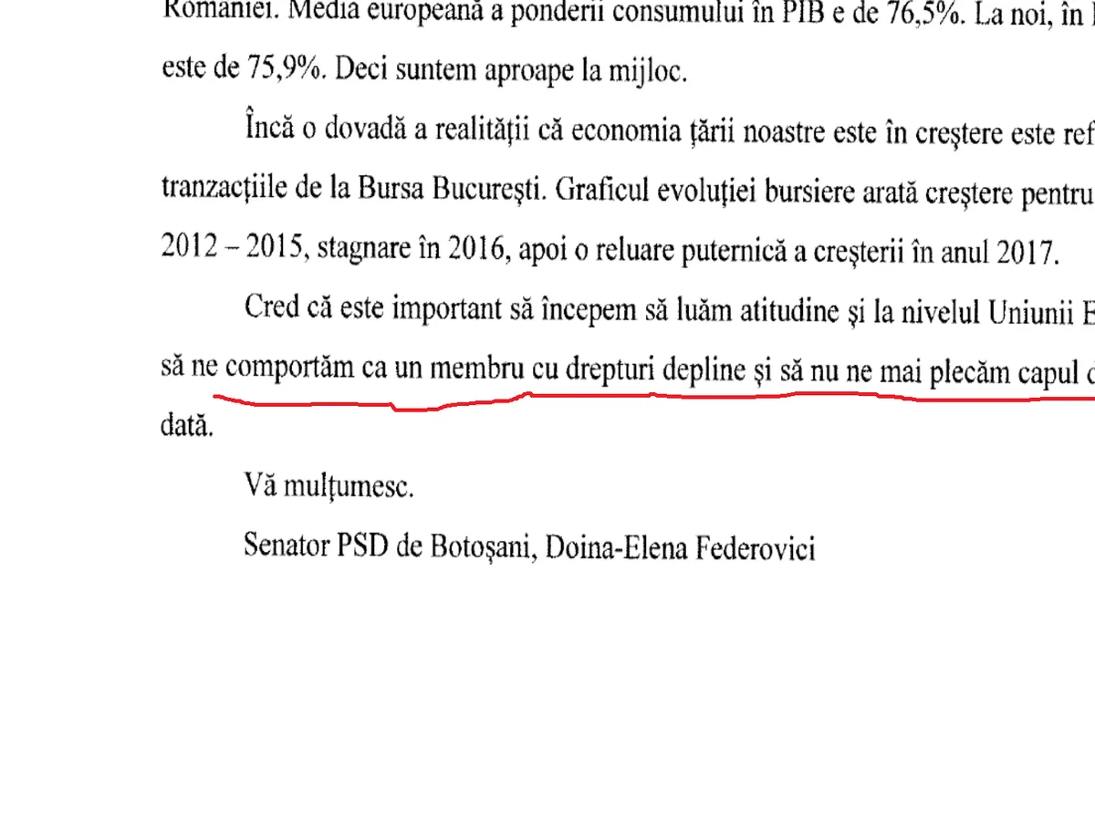 Senatoarea laudă curajul lui Dragnea de a-i scrie lui Juncker, președinte al Comisiei Europene la acea dată. Oficialul european atrăgea atenția că România va depăși deficitul de 3%. Senatoarea Federovici a sărit la gâtul UE așa cum i-ar fi plăcut lui Dragnea: