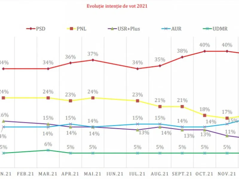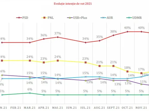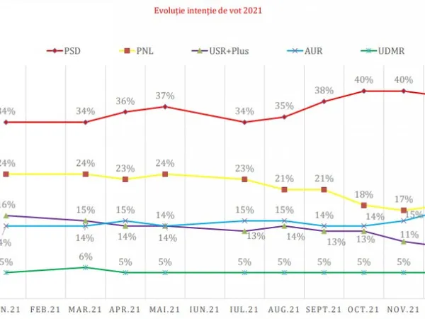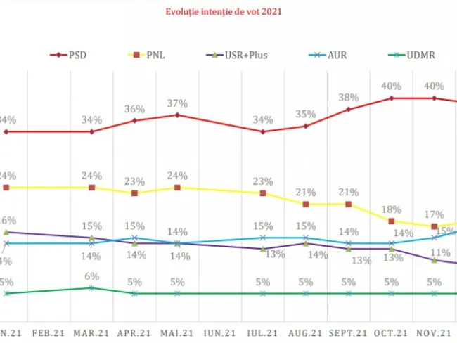 Dacă „mâine” ar fi alegeri: PSD - 39%, PNL - 18%, AUR - 17%, USR - 10%, UDMR - 5%