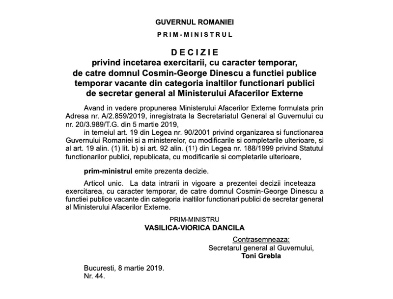 Totuși, limba "croată (satisfăcător)", pe lângă celelalte mențiuni din CV, nu a fost suficientă și Dinescu a fost dat afară pe 8 martie prin decizie a Vioricăi Dăncilă.